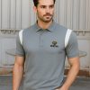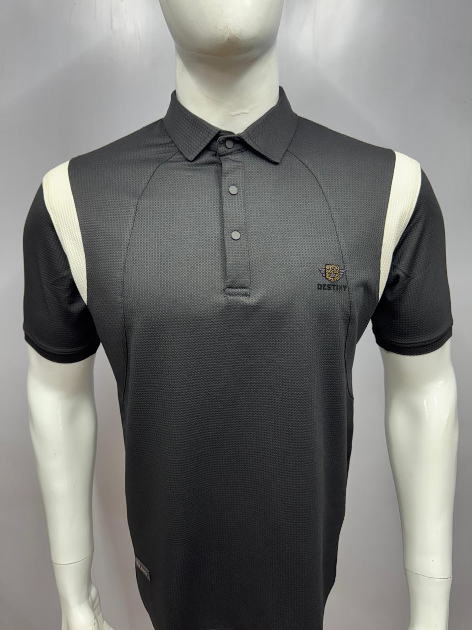 Trendy men’s polo t-shirt with white shoulder accents, button placket, and embroidered “DESTINY” logo. Made from breathable textured cotton blend fabric for casual wear, sports, and daily style.