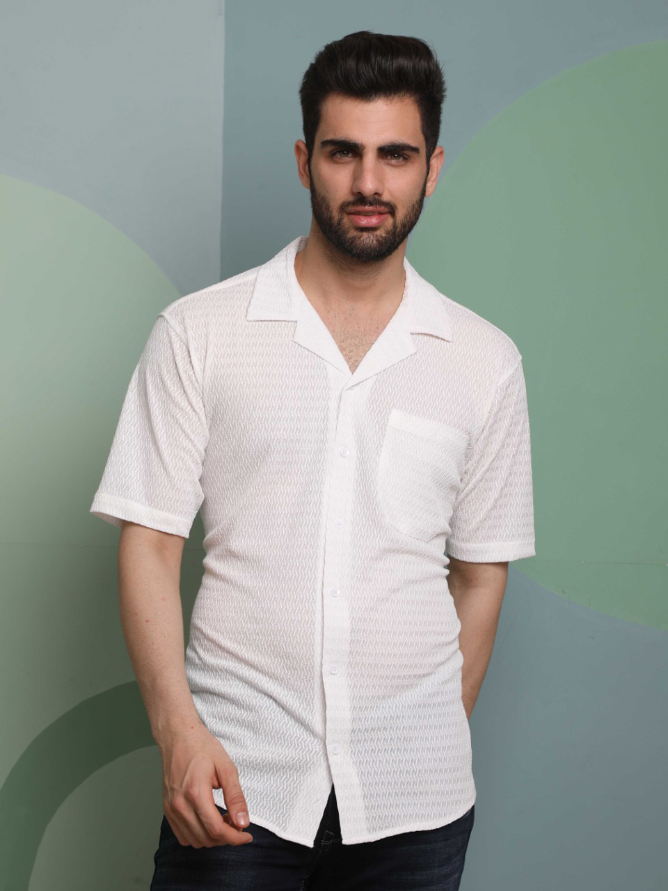 Add effortless elegance to your summer wardrobe with this white textured shirt for men, crafted from soft, breathable fabric and designed with a stylish Cuban collar.
