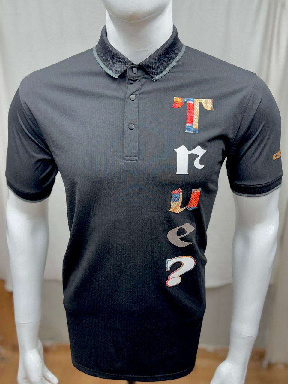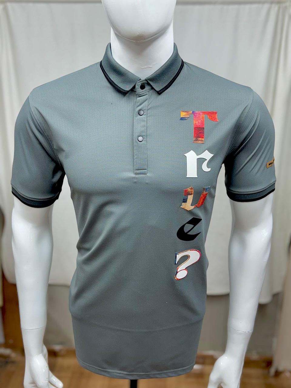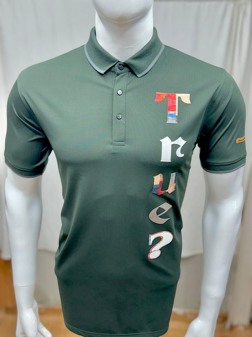 Make a bold and confident fashion statement with the Getzo Men’s Brown Polo T-Shirt, designed for the man who dares to question the norm. This sleek t-shirt is elevated with an artistic vertical “TRUE?” print composed of various font styles, adding a creative edge to your everyday wardrobe.