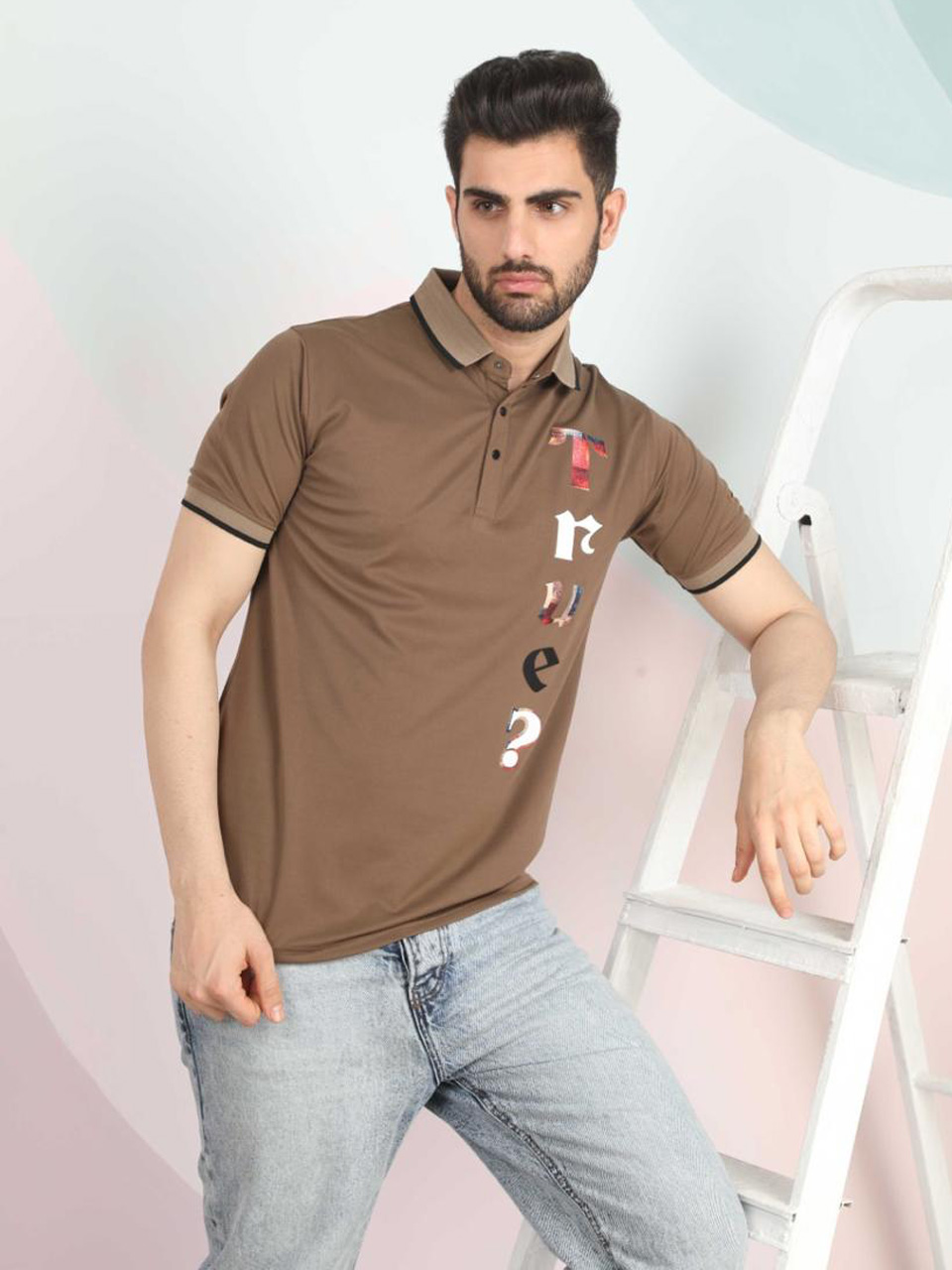 Stand out in style with Getzo’s brown polo t-shirt featuring a bold vertical “TRUE?” print and contrasting collar piping. A perfect blend of minimalism and statement fashion.