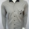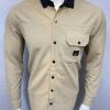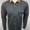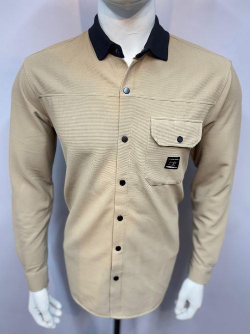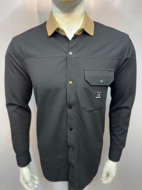 Stylish long sleeve shirt with a black collar and snap buttons, featuring a chest pocket with woven branding, made from waffle-textured fabric. Perfect for casual wear and layering.