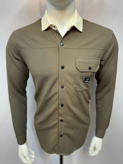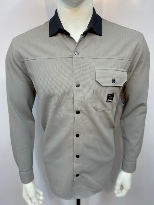 Discover modern style with this men’s long-sleeve casual shirt, designed with a unique waffle-textured fabric for both comfort and fashion. Featuring a sleek gray color with a contrasting black collar, this shirt is perfect for a variety of occasions.